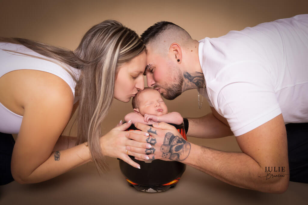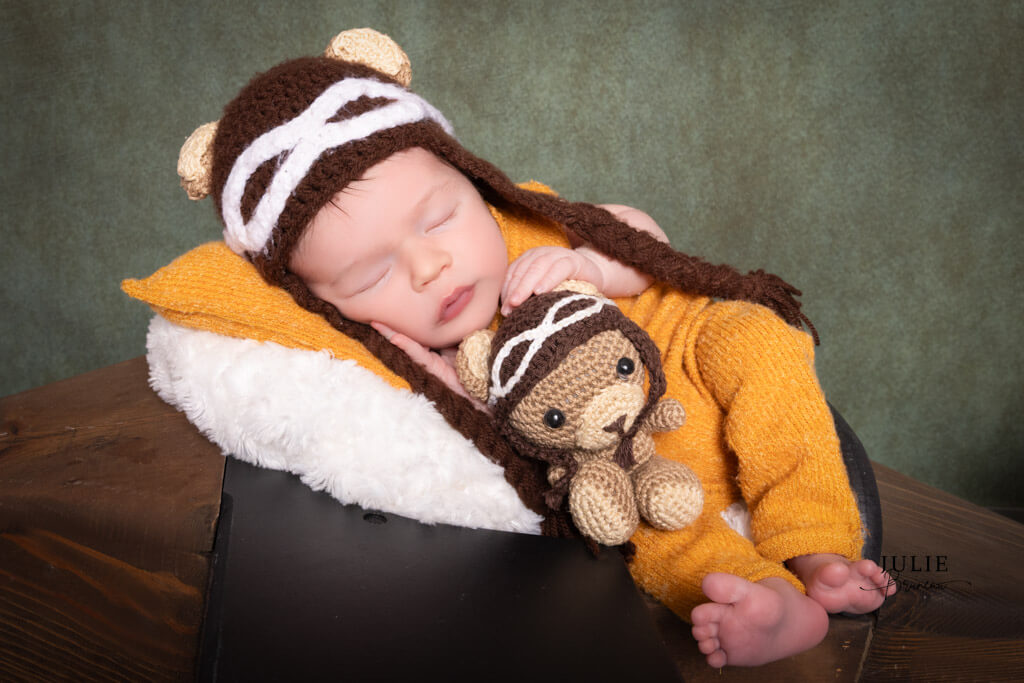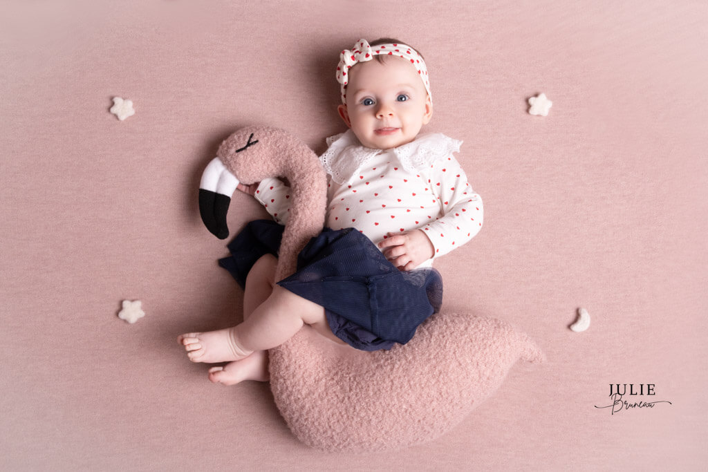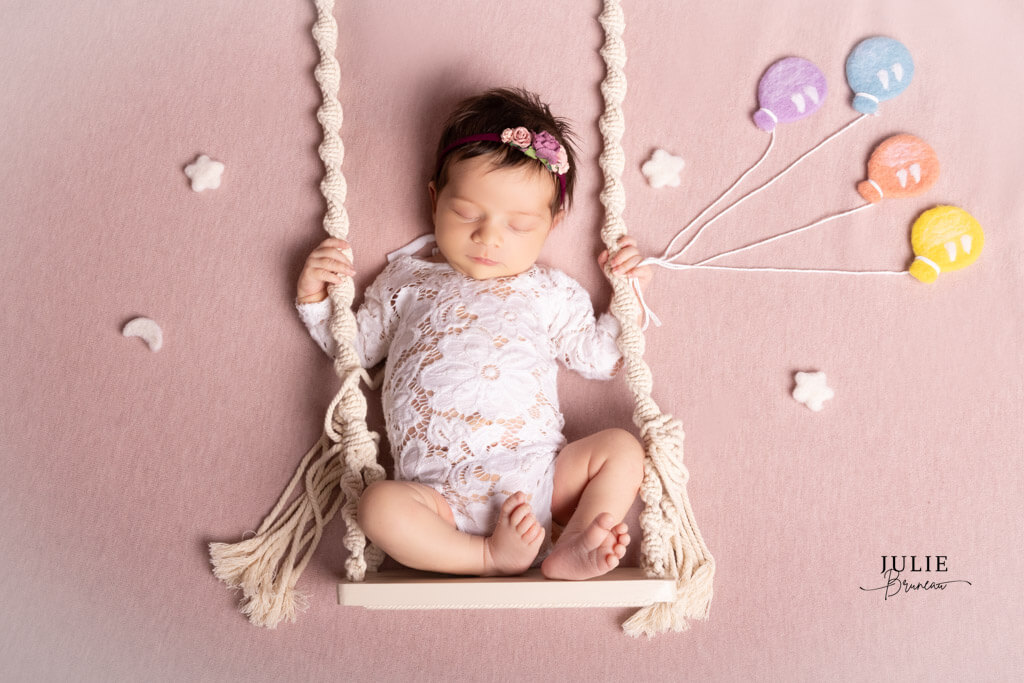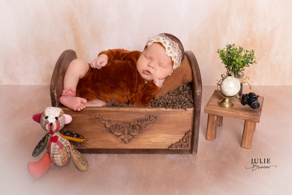 Durant cette séance, Julie met à votre disposition une variété de fonds de studio et de contenants uniques (avion, carrosse, piano, montgolfière, etc.) ainsi que divers vêtements et accessoires pour votre bébé. Les photos de famille sont également incluses, rendant la séance encore plus spéciale.